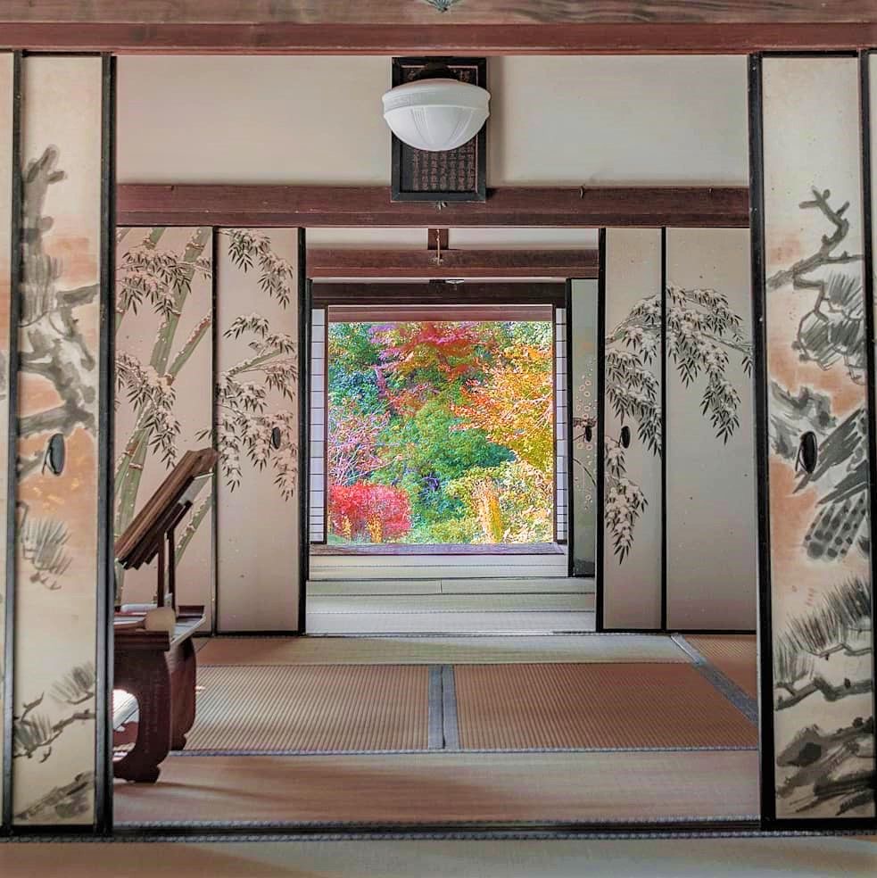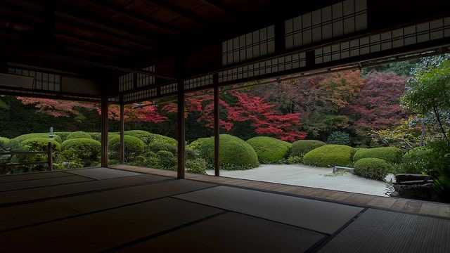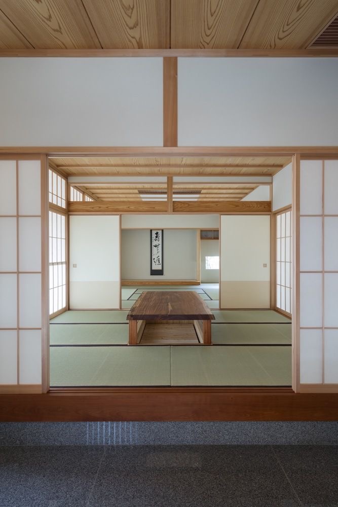 Shōji are very lightweight, so they are easily slid aside, or taken off their tracks and stored in a closet, opening the room to other rooms or the outside.[4][5][6] Fully traditional buildings may have only one large room, under a roof supported by a post-and-lintelframe, with few or no permanent interior or exterior walls; the space is flexibly subdivided as needed by the removable sliding wall panels.[7] The posts are generally placed one tatami – length (about 2m or 6ft) apart, and the shōji slide in two parallel wood-groove tracks between them.[8] In modern construction, the shōji often do not form the exterior surface of the building; they sit inside a sliding glass door or window.[5]